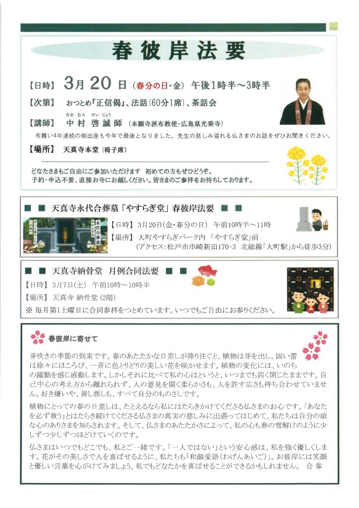 春彼岸は春分の日を中心とした七日間。「彼岸」とは、私たちがいるこの世「此岸」=迷いの世界に対して、彼の岸「彼岸」=さとりの世界を示します。自分の日頃の生活を省み、真実(彼岸)に至る道を問い聞かせていただく「仏教週間」。ぜひお寺にお参りし、皆さんでご聴聞致しましょう。